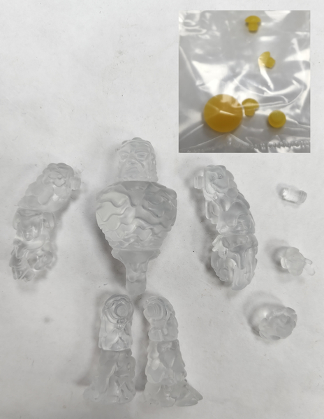 The Oozarian Watcher Series figure includes a complete Oozarian Builder clear colorless PVC (18 pieces) and 5 ABS semi translucent yellow armory buttons (1 large, 4 small).